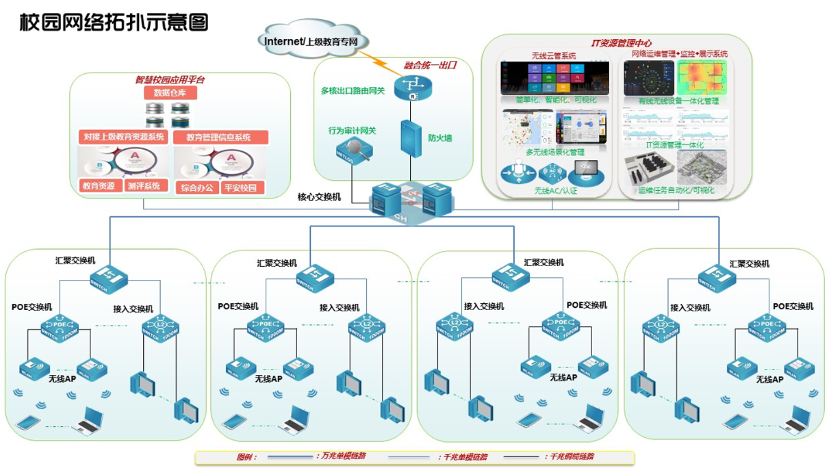 此次采用北京evo视讯真人官网云科信息技术有限公司的智慧校园方案,采用大二层的网络架构取代传统三层网络架构,校园网的接入、汇聚设备完全为纯二层设备,只在核心交换上启用三层路由。